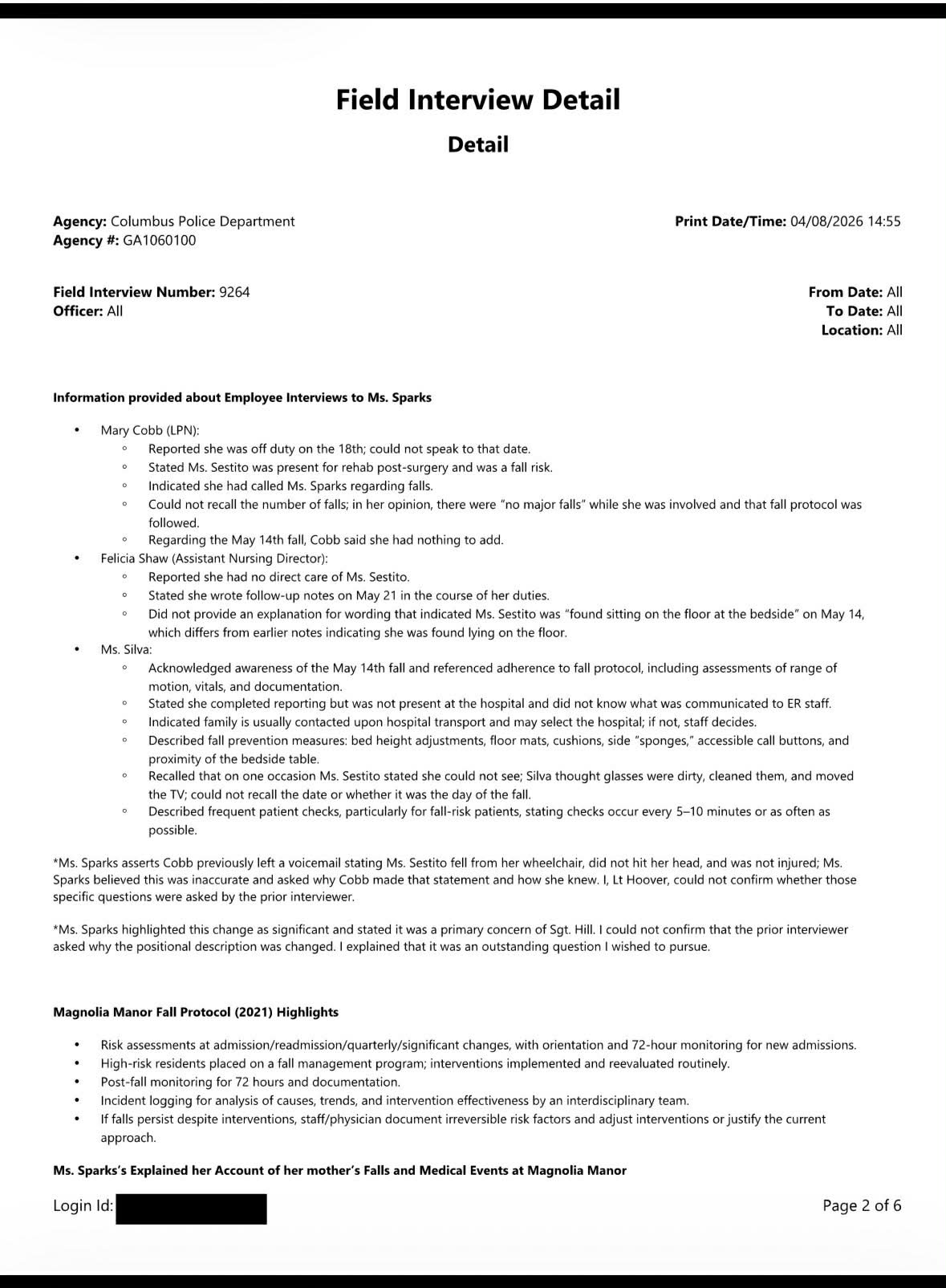 Columbus Police Department Field Interview Detail showing employee interviews regarding Linda Sestito's fall at Magnolia Manor